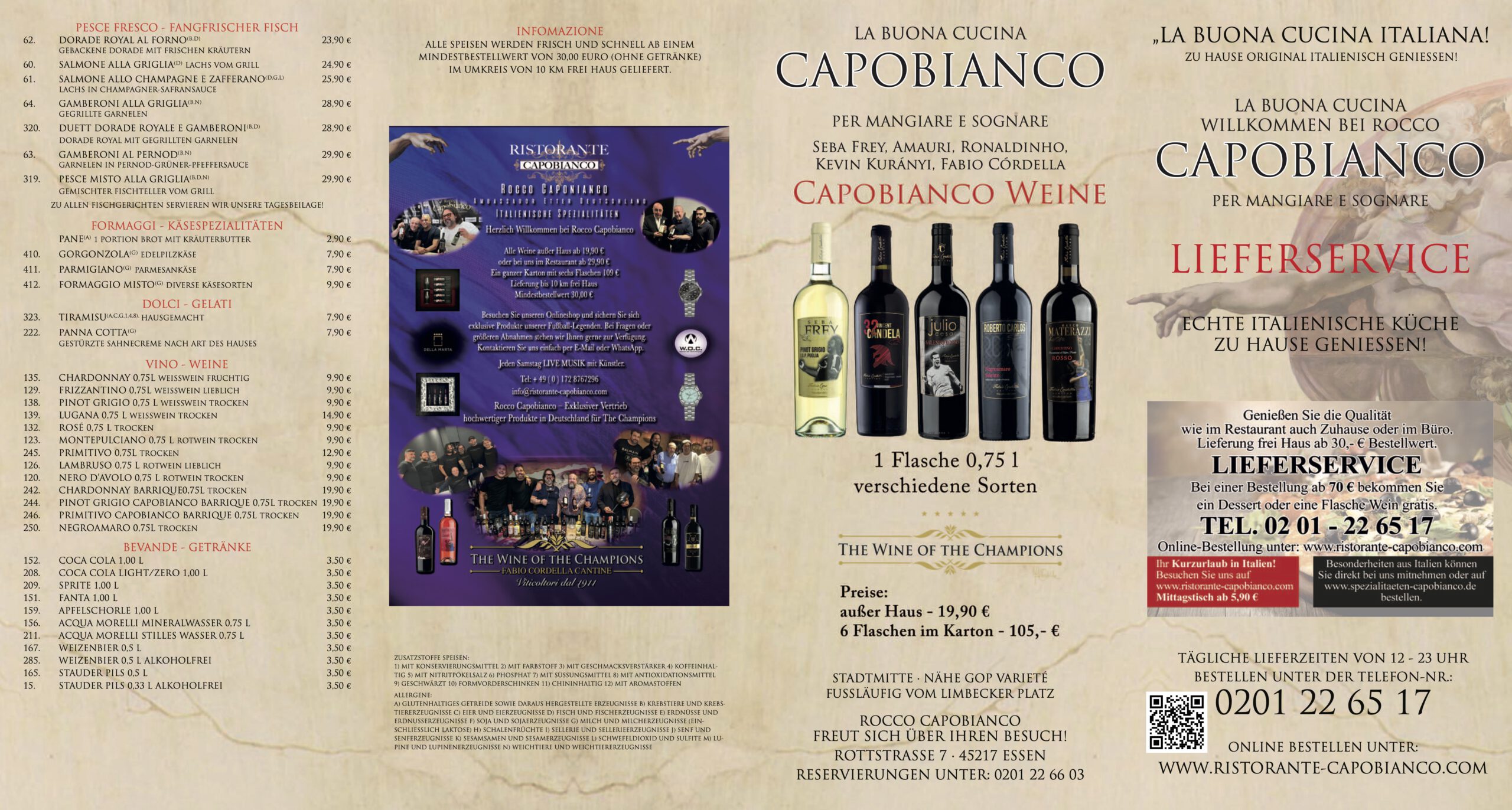 Wir bieten Ihnen mittags und abends eine freie Speisenauswahl mit hausgemachten Nudeln, Pizza und frischen Fisch- und Fleischspezialitäten, die alle mit viel Liebe und Sorgfalt für Sie von unserem Chefkoch Rocco Capobianco persönlich zubereitet werden.